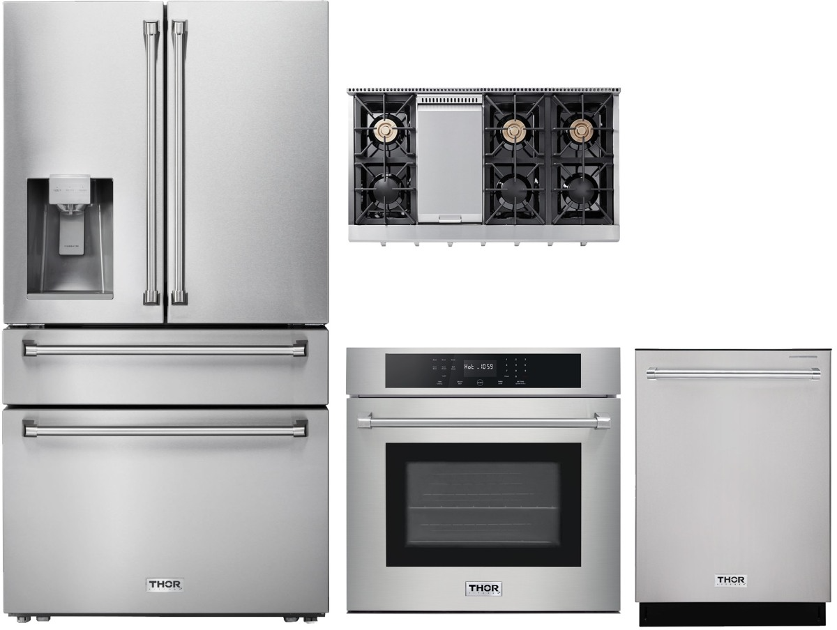Thor Kitchen® 4 Piece Stainless Steel Kitchen Package with a French door refrigerator, gas rangetop, single electric wall oven and built in dishwasher.Read More